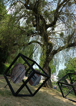 BRIONNE " Patrimoine et rivières sur..." 2 cubes 145 x 145 x 145 bois brûlé, plexiglass, miroir, photo, ronds torsadés